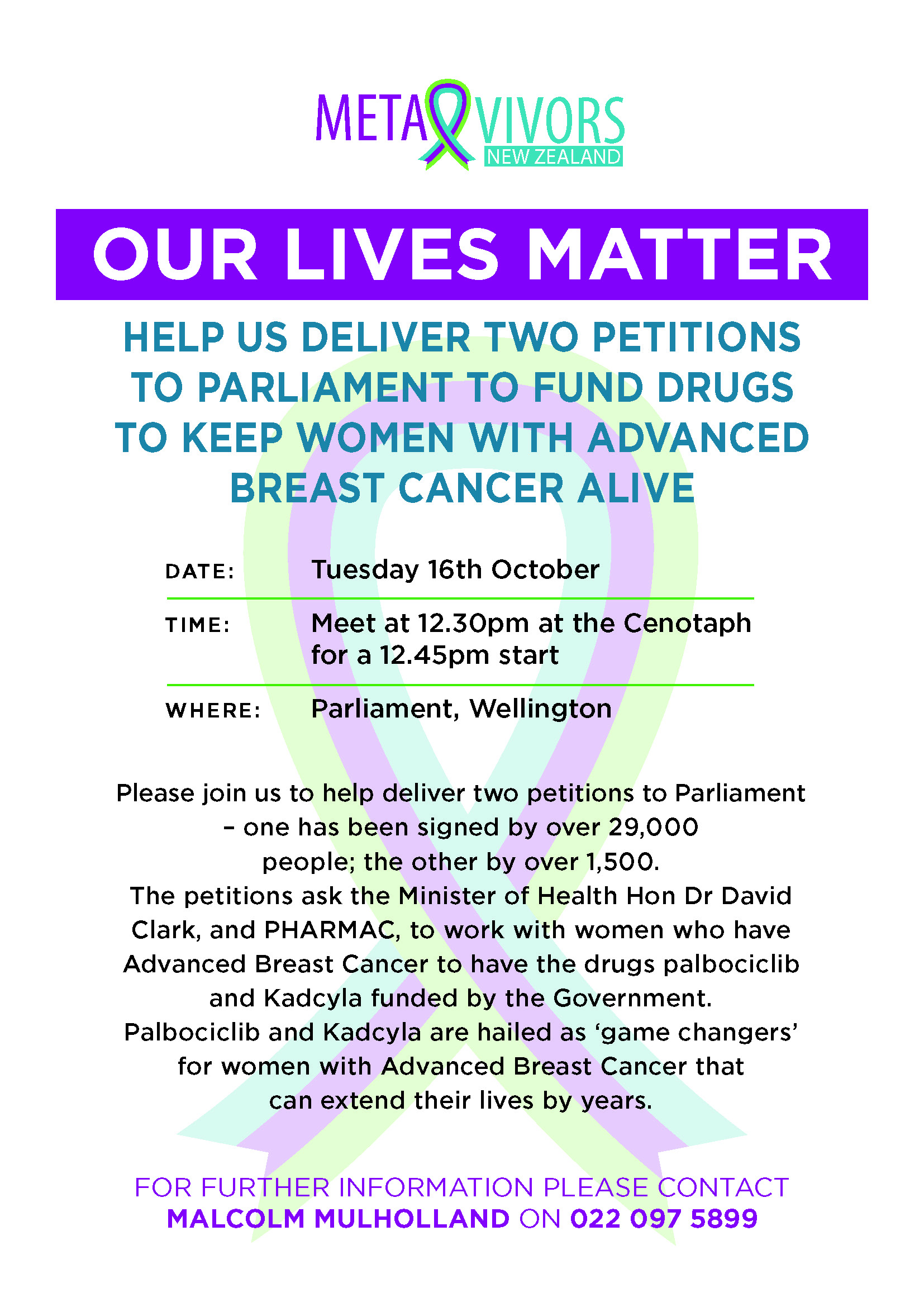 Women with breast cancer, their family, whanau and supporters are marching to Parliament on 16 October to present petitions to MPs – calling for the funding of breakthrough advanced breast cancer medicines Ibrance and Kadcyla.